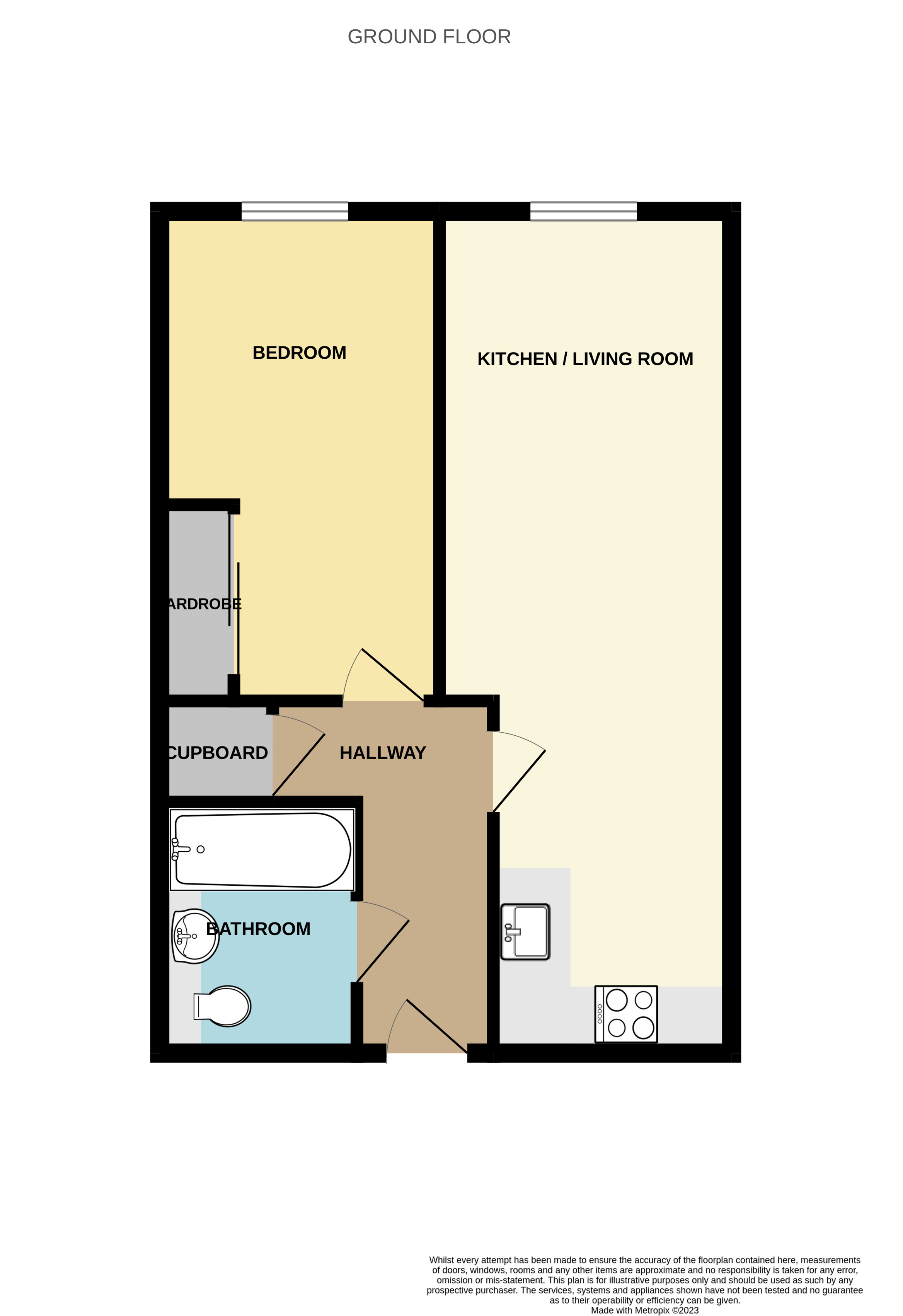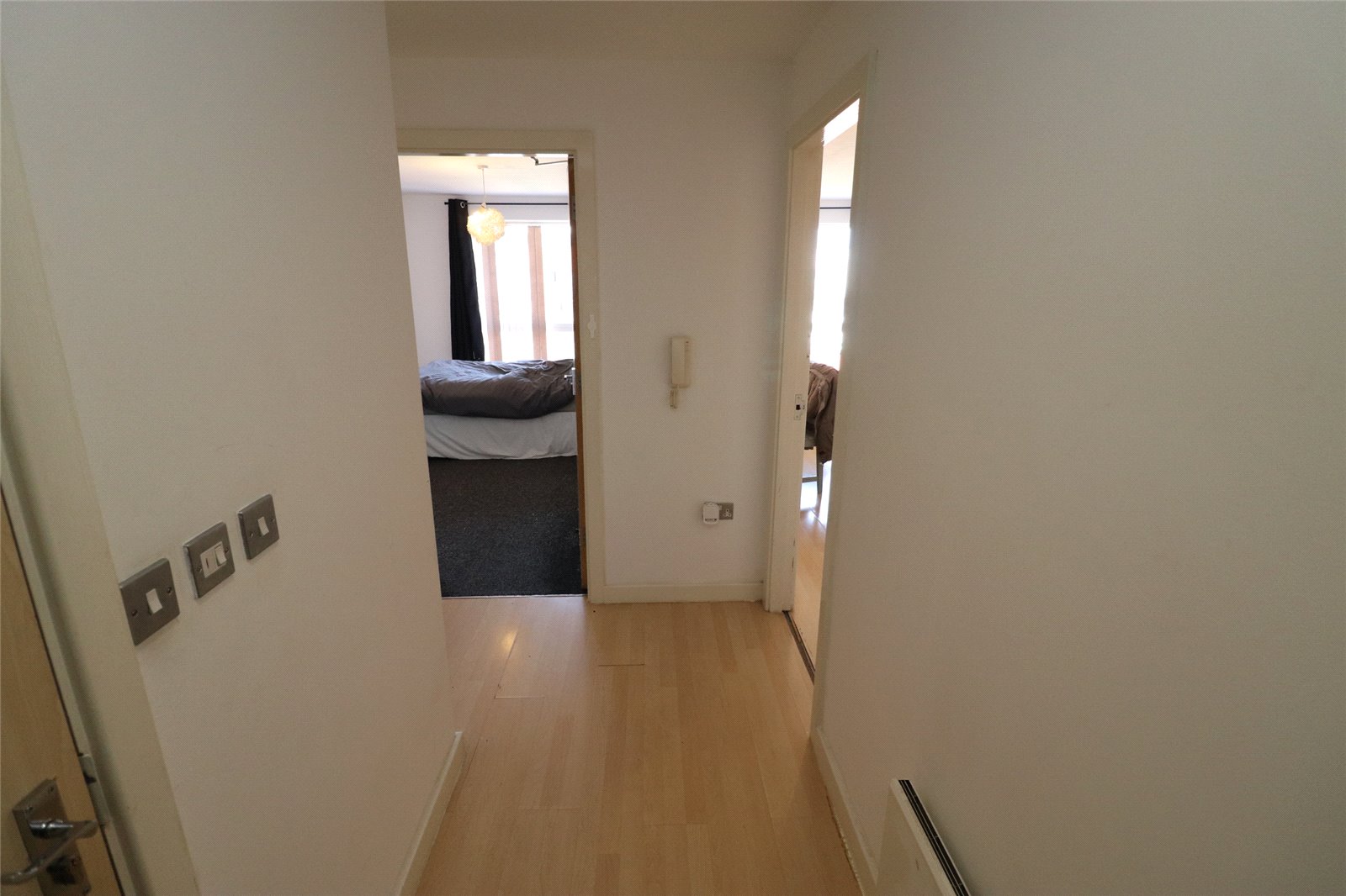 Entering into the property you step into a hallway with laminate flooring, a wall-mounted electric radiator, intercom system, and a cupboard containing the boiler. With doors leading to the living room, bedroom and bathroom.