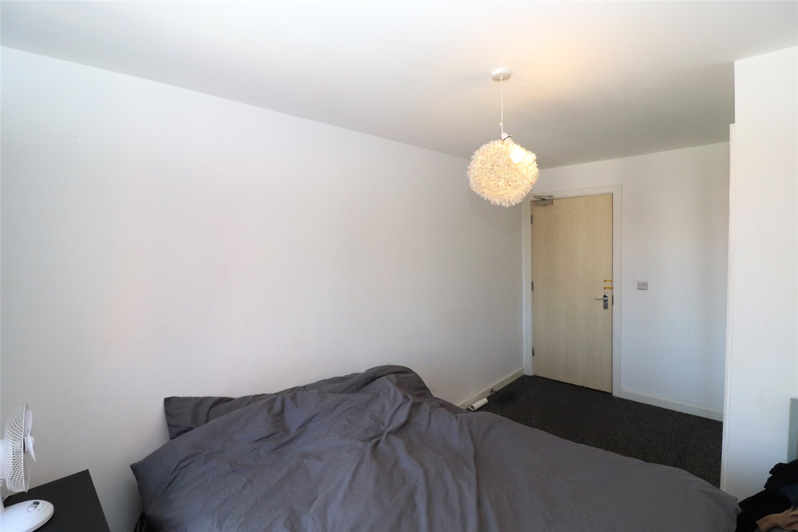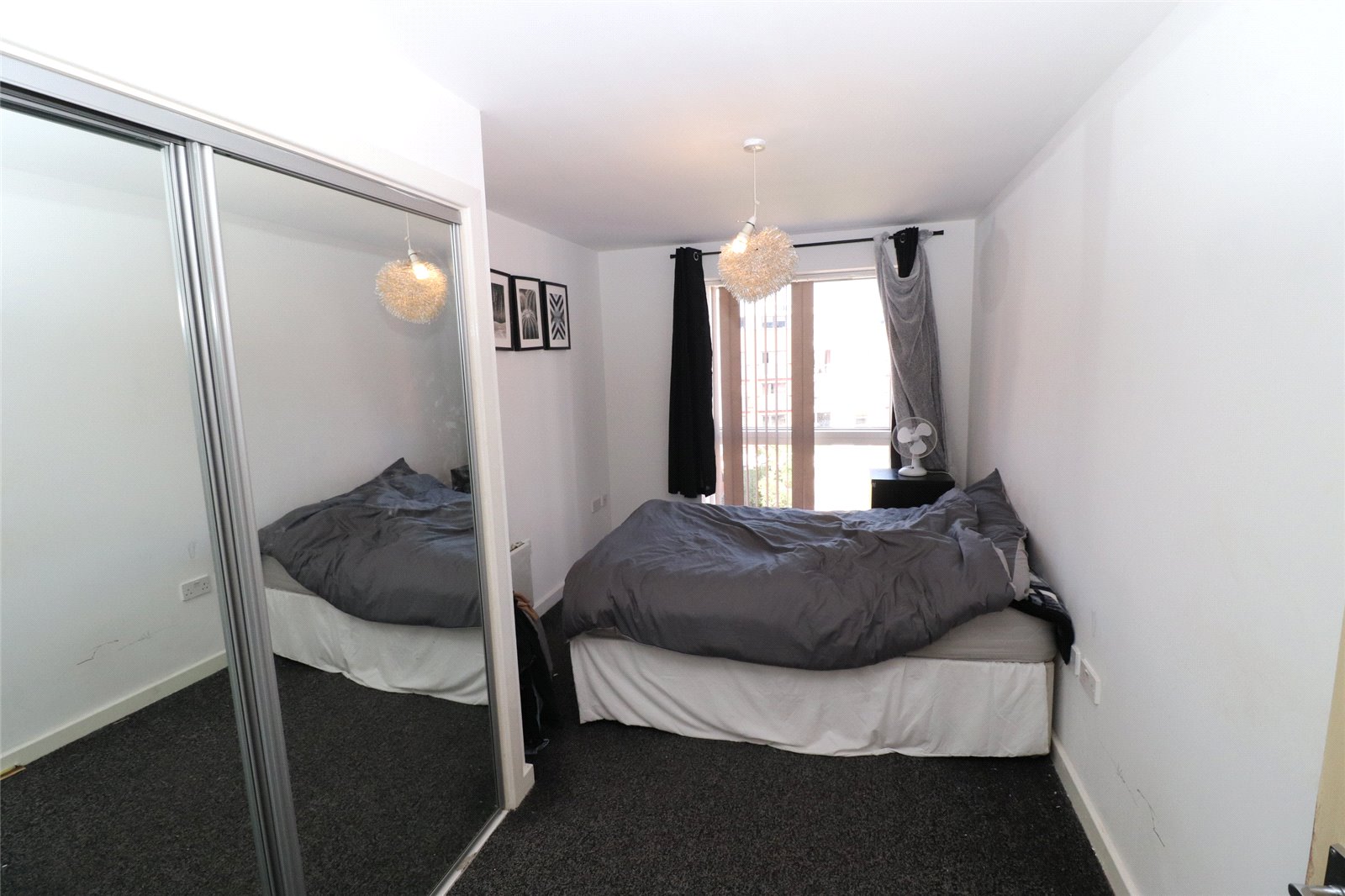 Spacious double bedroom with a large fitted wardrobe, carpet flooring, wall-mounted electric radiator, and a floor to ceiling window overlooking the coummunal courtyard.