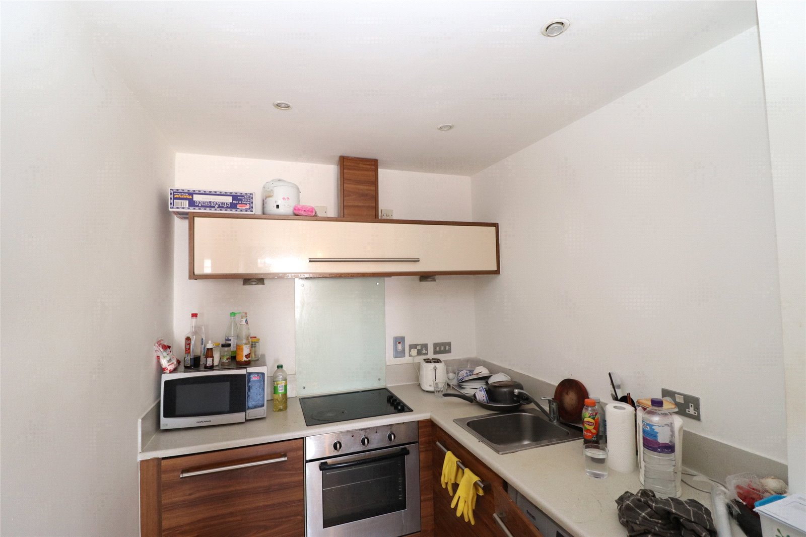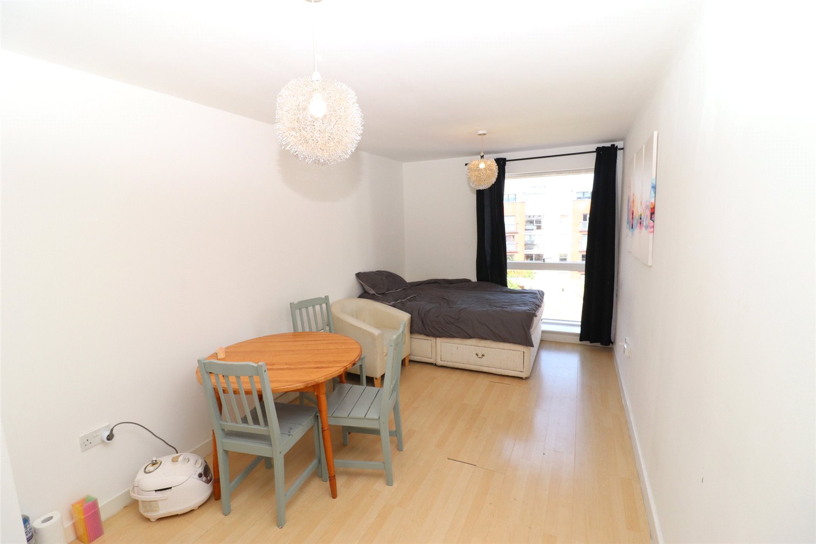Open-plan kitchen living area with laminate flooring, wall-mounted electric radiators and a floor to ceiling window facing out to the development's communal courtyard. The kitchen comprises base cabinets with counter top above, integrated washing machine, electric oven and hob with extractor fan above.