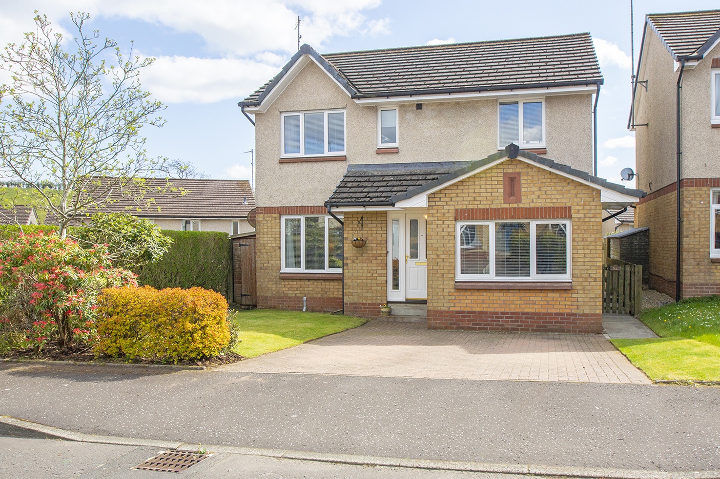 Theaccommodation: entrance hallway, large spacious front facing lounge withfeature bay window, modern kitchen/diner with integrated appliances with twinFrench doors giving access to the garden, handy downstairs cloakroom, staircaseleading to first floor. On the firstfloor there are 3 bedrooms. Bedroom twohas its own ensuite and fitted wardrobes. There is also a modern family bathroom. On the second level the main bedroom has great storage and its ownensuite. Gas CH. DG. Contemporary décorwith quality fitments throughout. Large driveway offering parking for severalcars leading to detached garage with power and light. Well maintained garden to front and fullyenclosed very private rear garden with patio grassed and planted areas. Early viewing advised of this lovely familyhome.